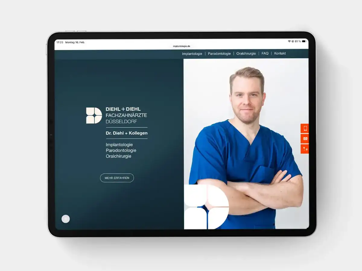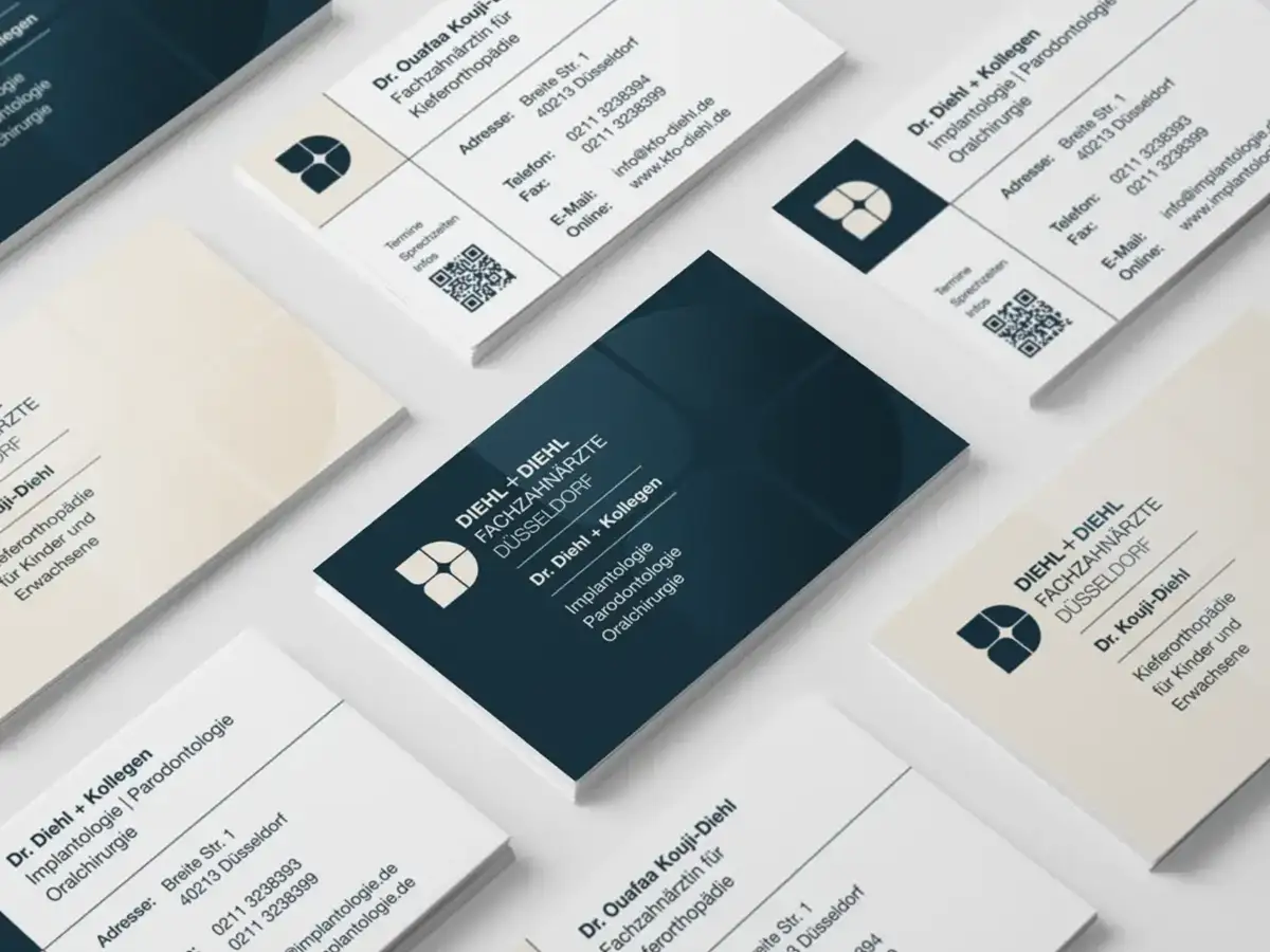 Für die Fachzahnärzte Diehl+Diehl in Düsseldorf wurde ein ganzheitlicher Markenauftritt entwickelt, der die Spezialisierungen auf Implantologie und Kieferorthopädie präzise und zugleich zugänglich kommuniziert. Ziel war es, eine visuelle Identität zu schaffen, die medizinische Kompetenz, Vertrauen und ästhetischen Anspruch in Einklang bringt – sowohl im analogen Erscheinungsbild als auch in der digitalen Anwendung. Zentrales Gestaltungselement ist ein flexibles Corporate Design, das auf zwei Farbvarianten basiert.
